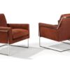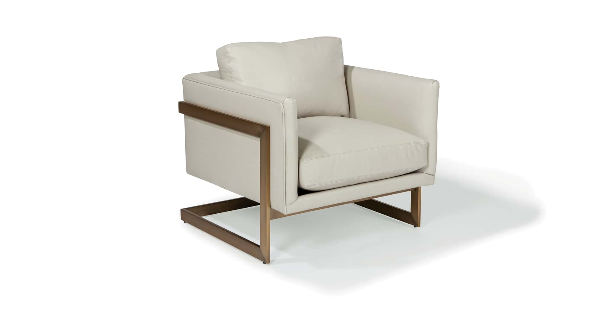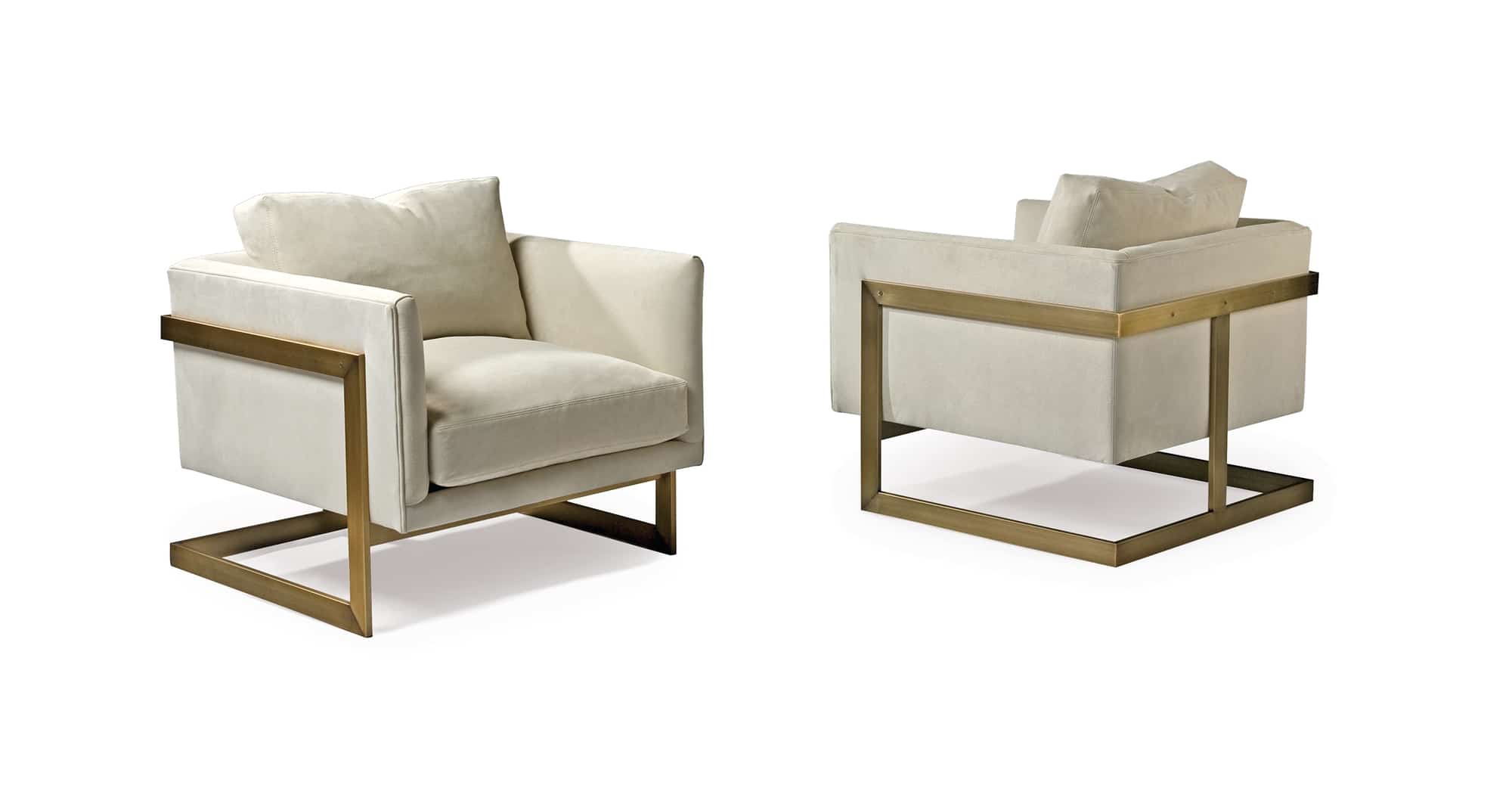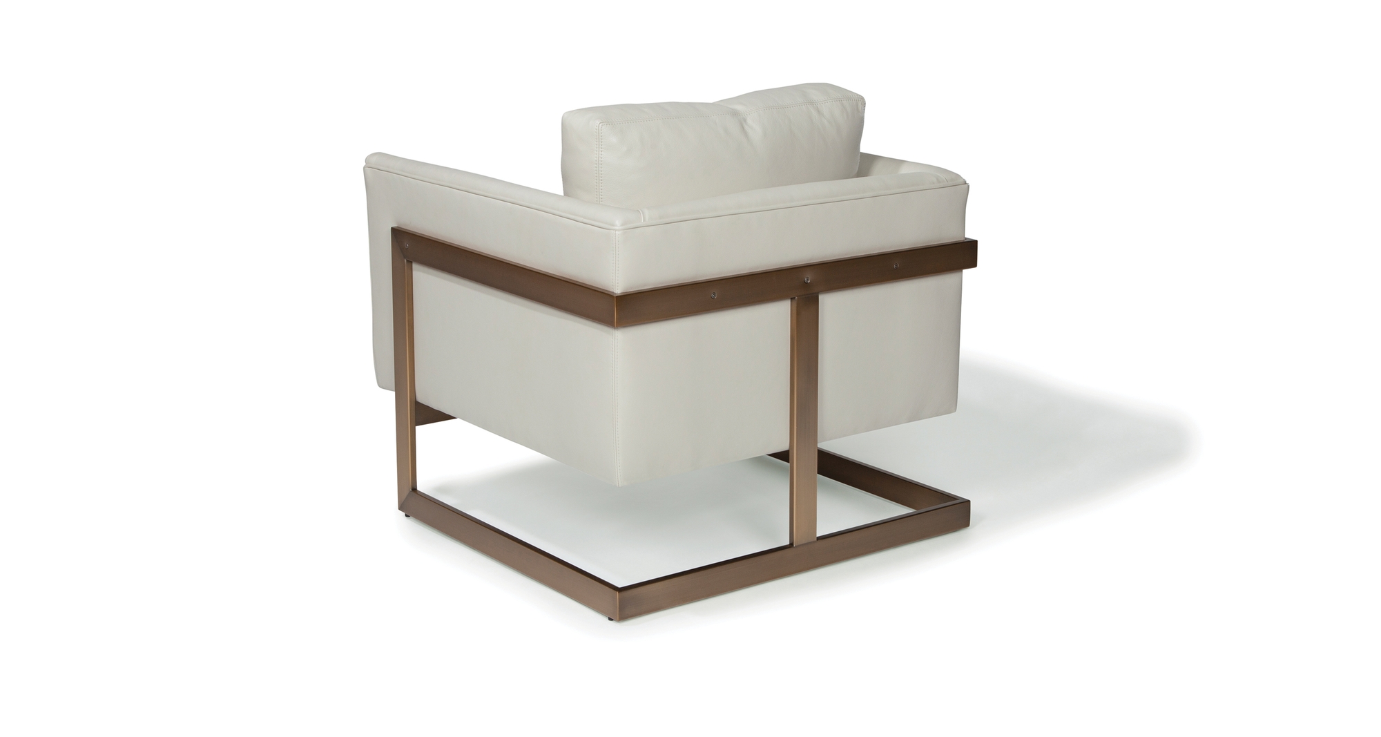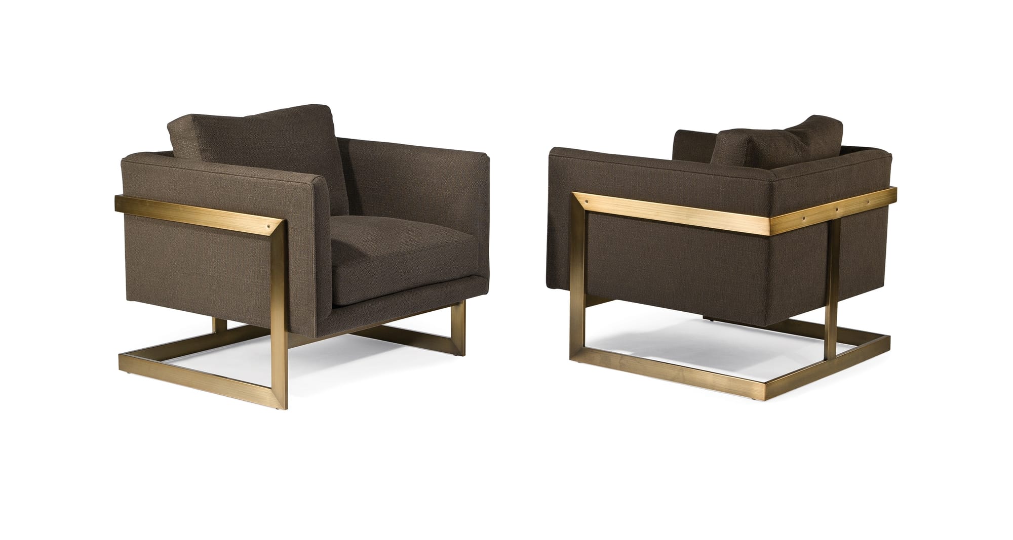 Originally designed in 1968 by Milo Baughman, the 989 is a timeless classic of the modern era. This visually arresting chair features an upholstered cube that seems to float inside an angular, flat-bar metal frame. With its inviting thick, loose cushions, the 989 lounge chair combines big comfort with glamorous profiles from all angles. The 989 is affectionately known as the “T-back” chair, as its exposed metal frame forms a “T” when viewed from the rear. Steel frame available in brushed bronze (No. 989-103-B), polished stainless steel (No. 989-103), satin brass (No. 989-103-SB), powder coat black (No. 989-103-BPC), white powder coat (No. 989-103-WPC) or gray powder coat (No. 989-103-GPC) metal finish. Select from any of our in-house curated fabrics or leathers for upholstery.