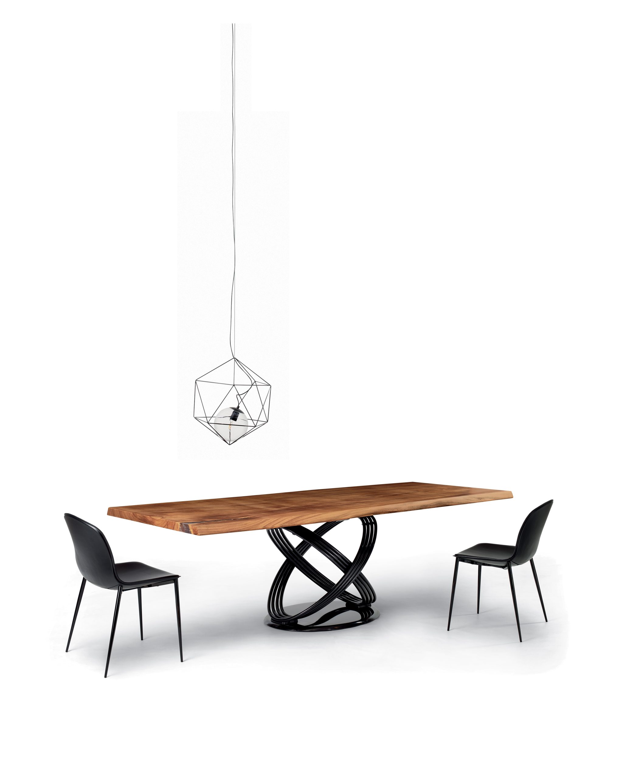 Table fix or with extensions with lacquered Metal rings. Base in lacquered Metal, Veneer wood or SuperMarble. Top in Solid wood, heritage walnut Solid wood, Veneer wood with solid edge, Veneer wood, Glass, velvet matt Anti-scratch Glass natural Marble, SuperMarble or SuperCeramic