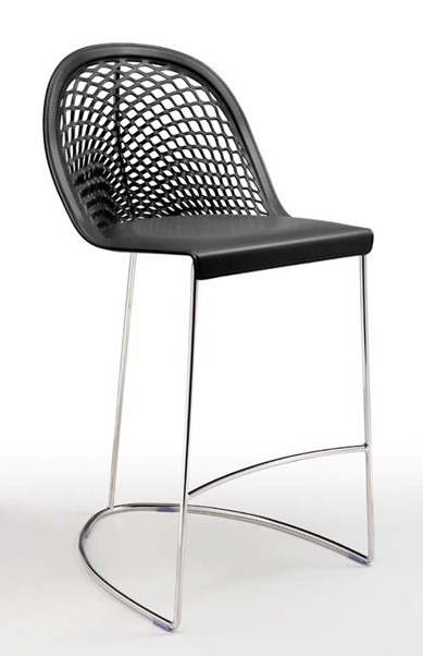 Stool with sled base and footrest. Structure available in painted or chromed steel and shell in leather.