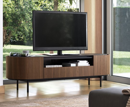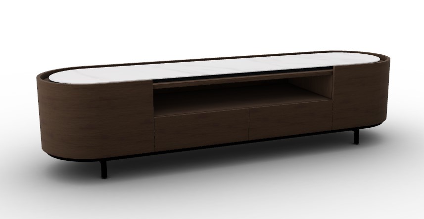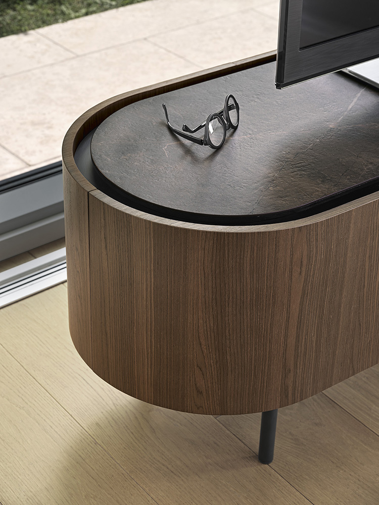 A piece of furniture which stands apart for its sleek harmonious lines, the LAKE sideboard is an entertainment unit with an open compartment. On a raised base, it has an oval shape and its beauty is enhanced by the ceramic top which is slightly set back from the edge, creating a space between door and top which is useful for opening doors and drawers. This item has been veneered all over, making it ideal for a whole variety of uses.