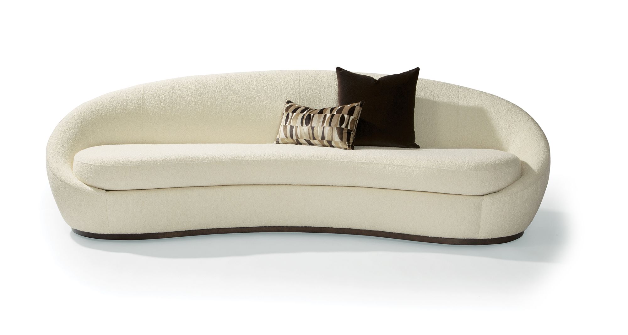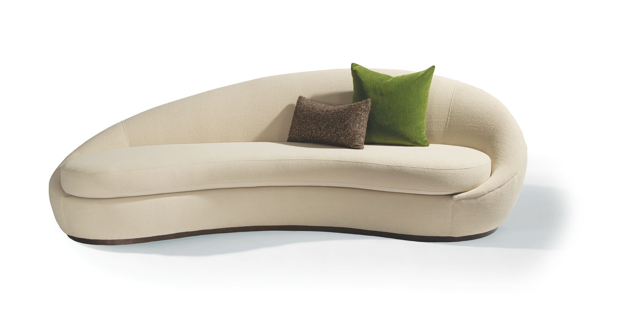 Evoking the glamorous streamline era of midcentury modern design, the Monroe sofa presents an extraordinary, intimate seating experience with a sculptural form to be enjoyed from all angles. With soft and curvaceous shapes, the Monroe sofa is defined by couture details and comfort. Delicate wood trim accent, like a platform, with hidden feet beneath, support Monroe and make her appear to float on air. Solid maple base available in any TC wood finish on maple. Monroe collection designed by Rick Lee.