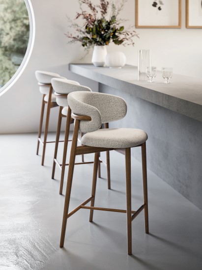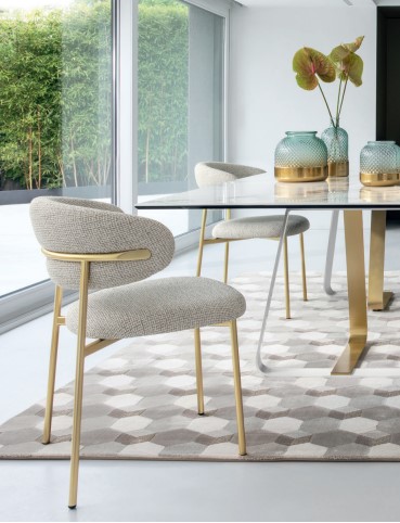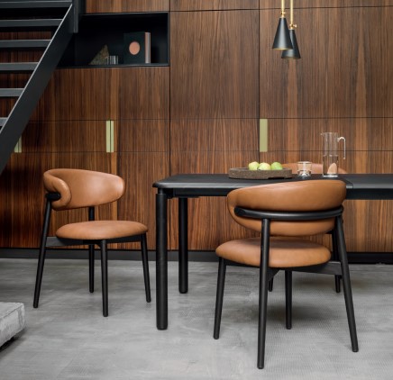 OLEANDRO is a padded chair with a wooden base and a seat that delivers sheer comfort and modern open-back style. The curved chair seat and backrest gently hugs you with generous soft padding available in various kinds of upholstery.