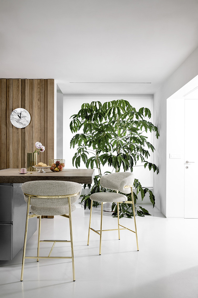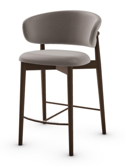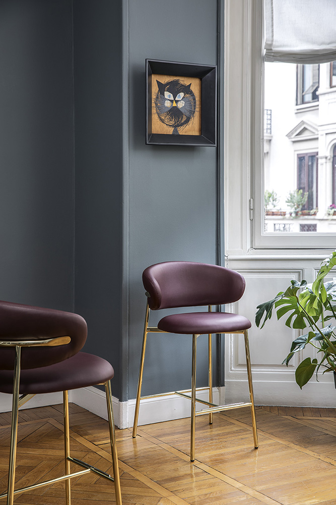 OLEANDRO is a padded stool with a wooden or metal base and a seat that delivers sheer comfort – the chair seat and backrest have a generous soft padding available in various kinds of upholstery. One stylish touch on this model is to be found on the end of the wooden backrest frame which has been masterfully whittled into a flattened tip