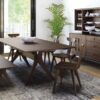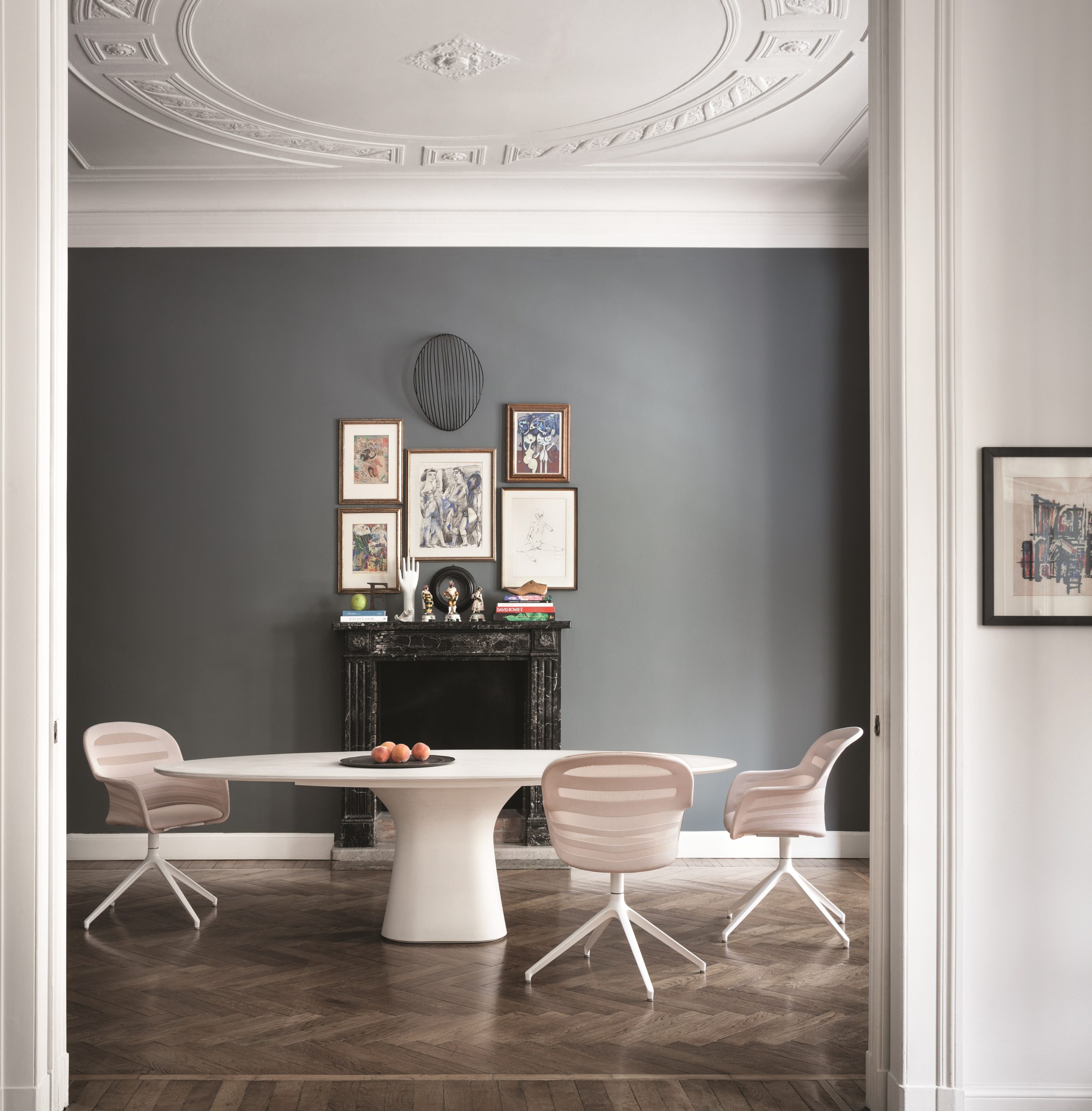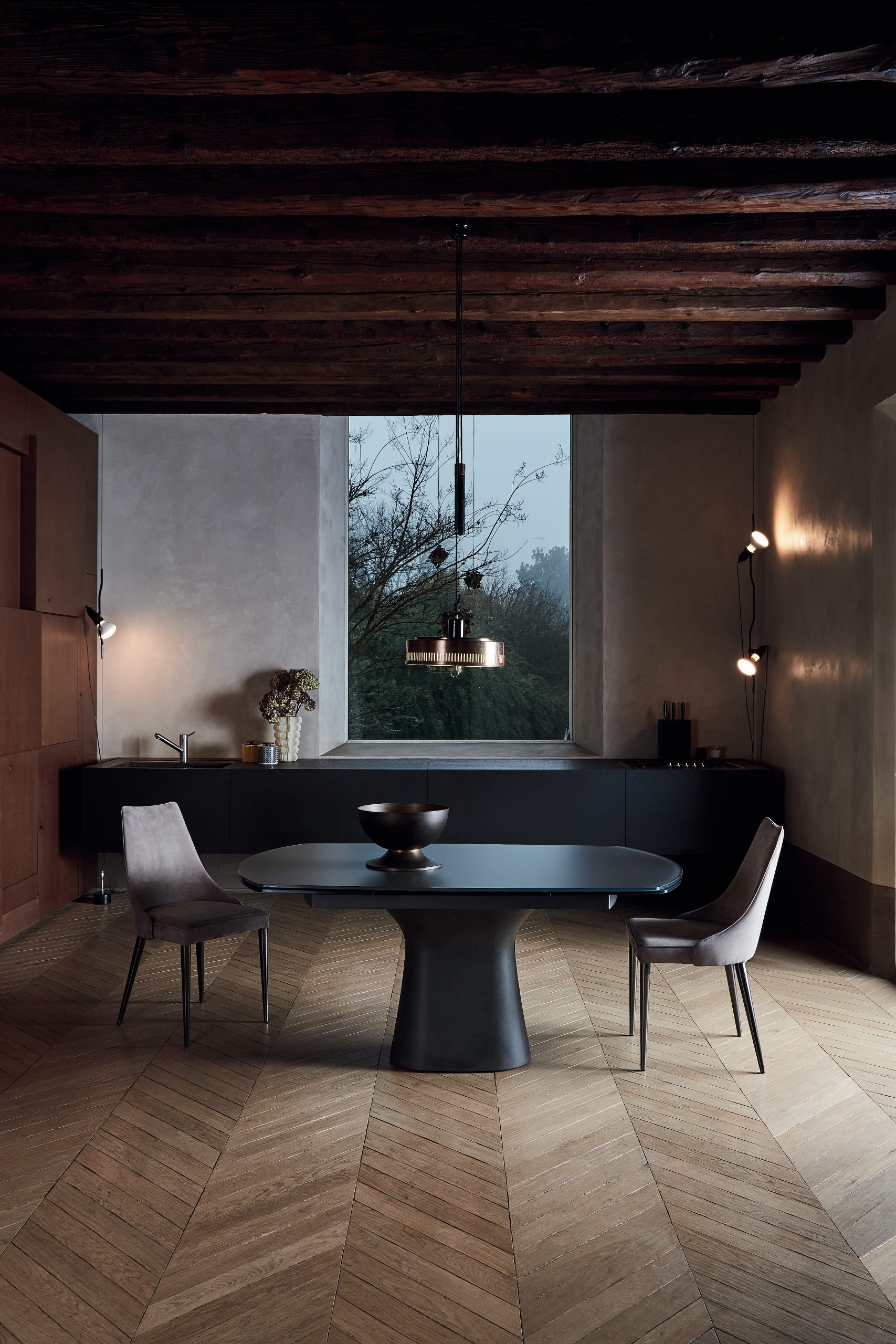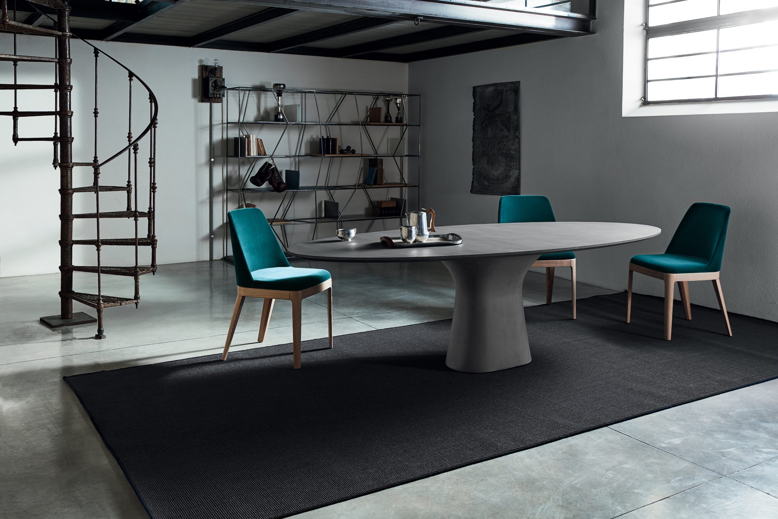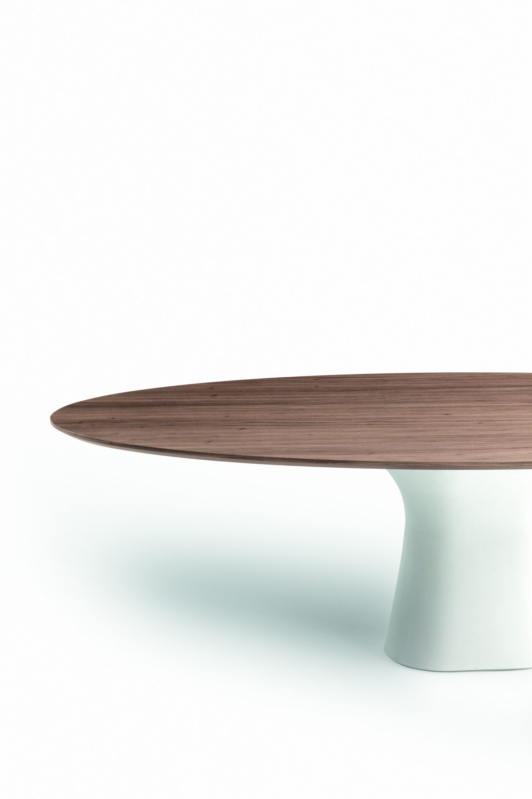 The Podium table features oval, rounded corner, fixed and extendible table versions with self-storing leaf and a concrete pedestal. Tabletop in Veneer wood, glass, concrete and SuperMarble.