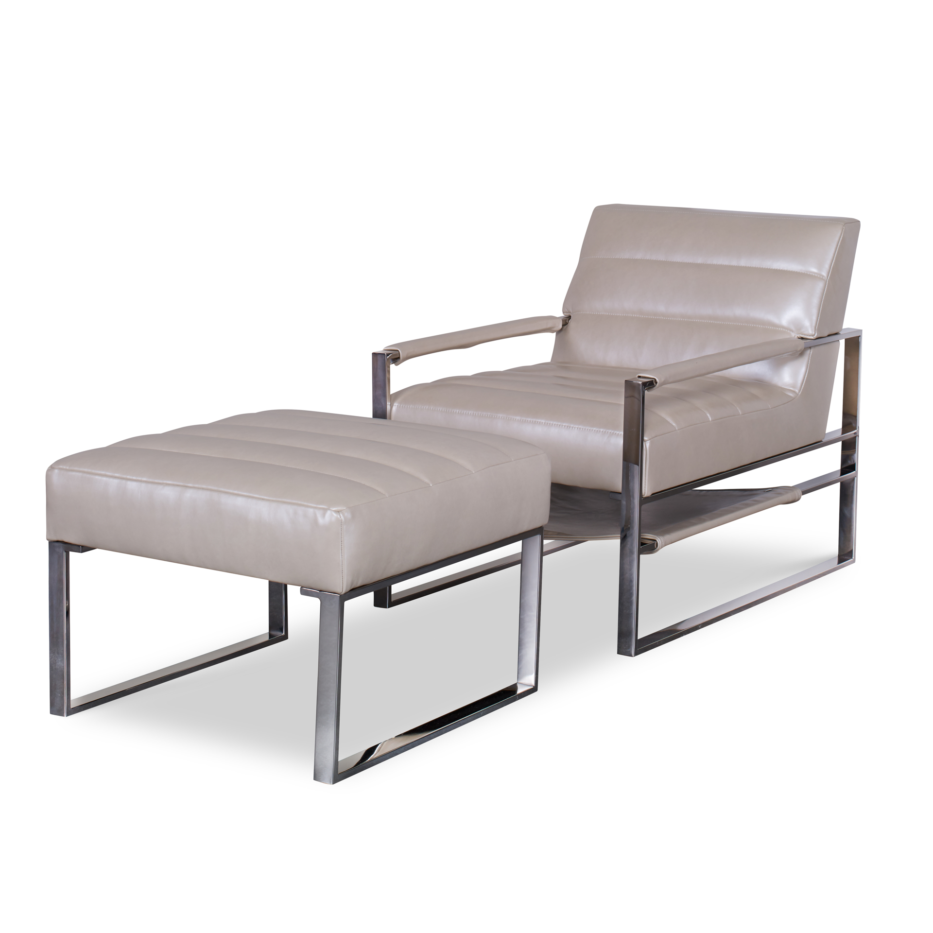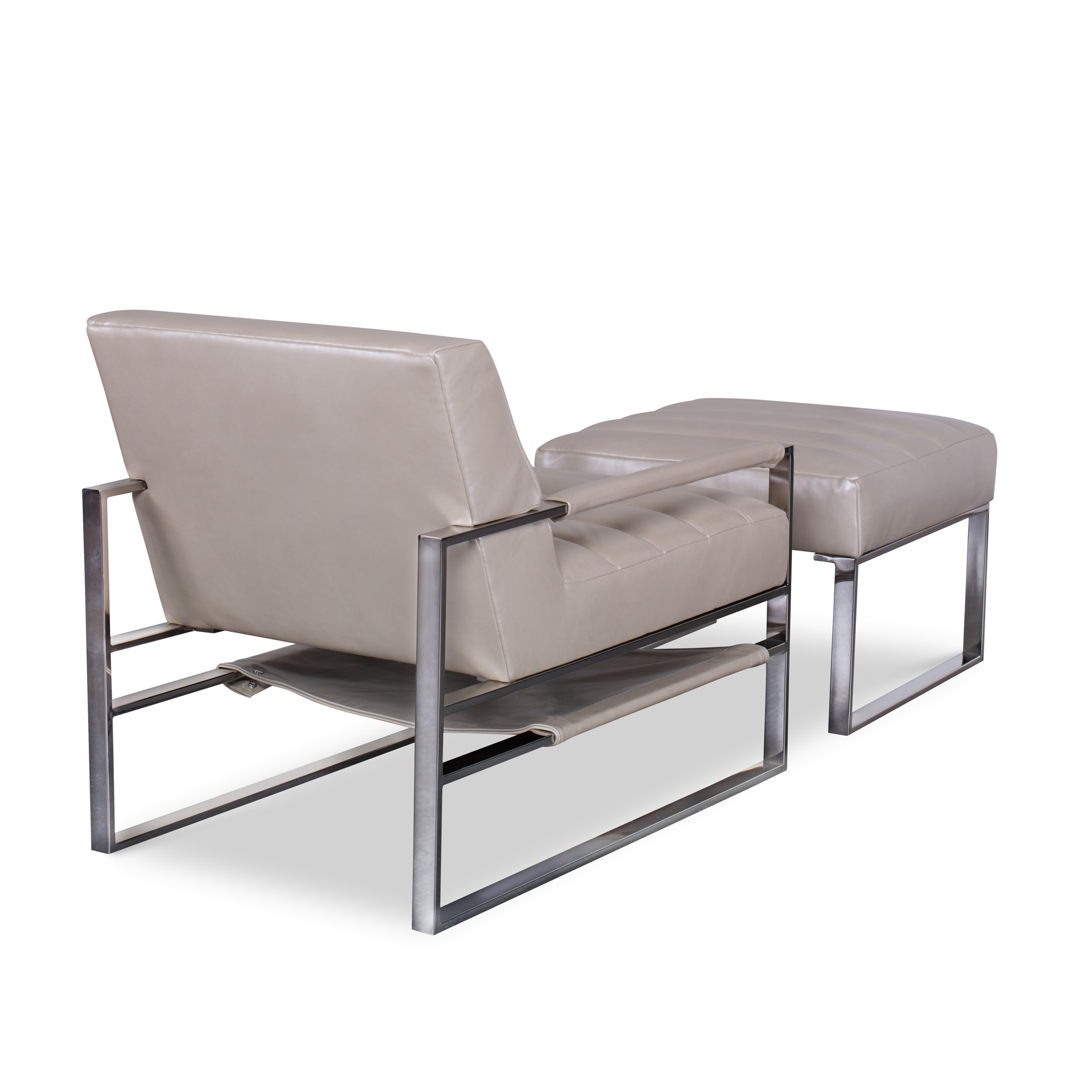 Handsome modern lounge chair and ottoman with clean lined metal frame.