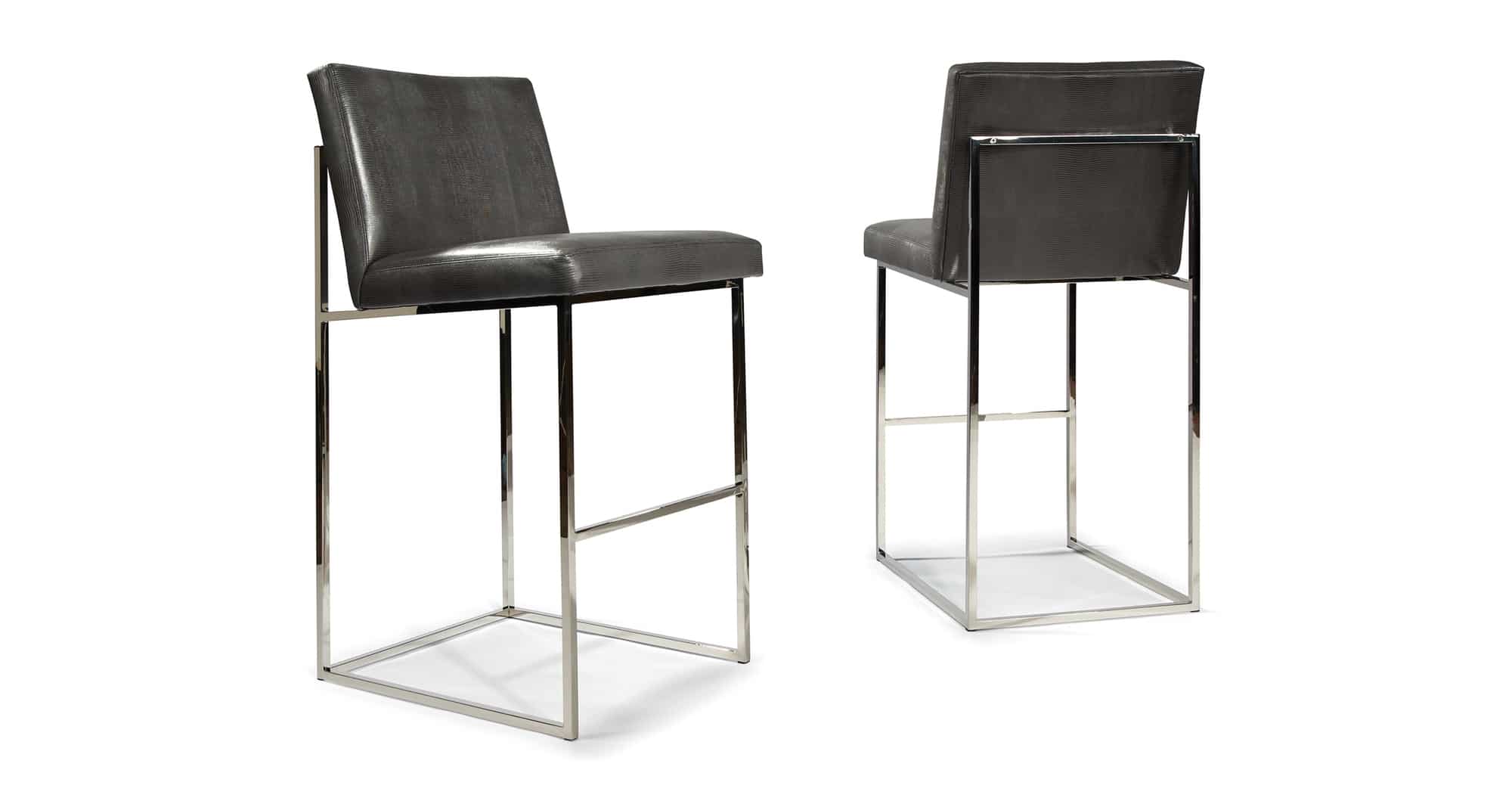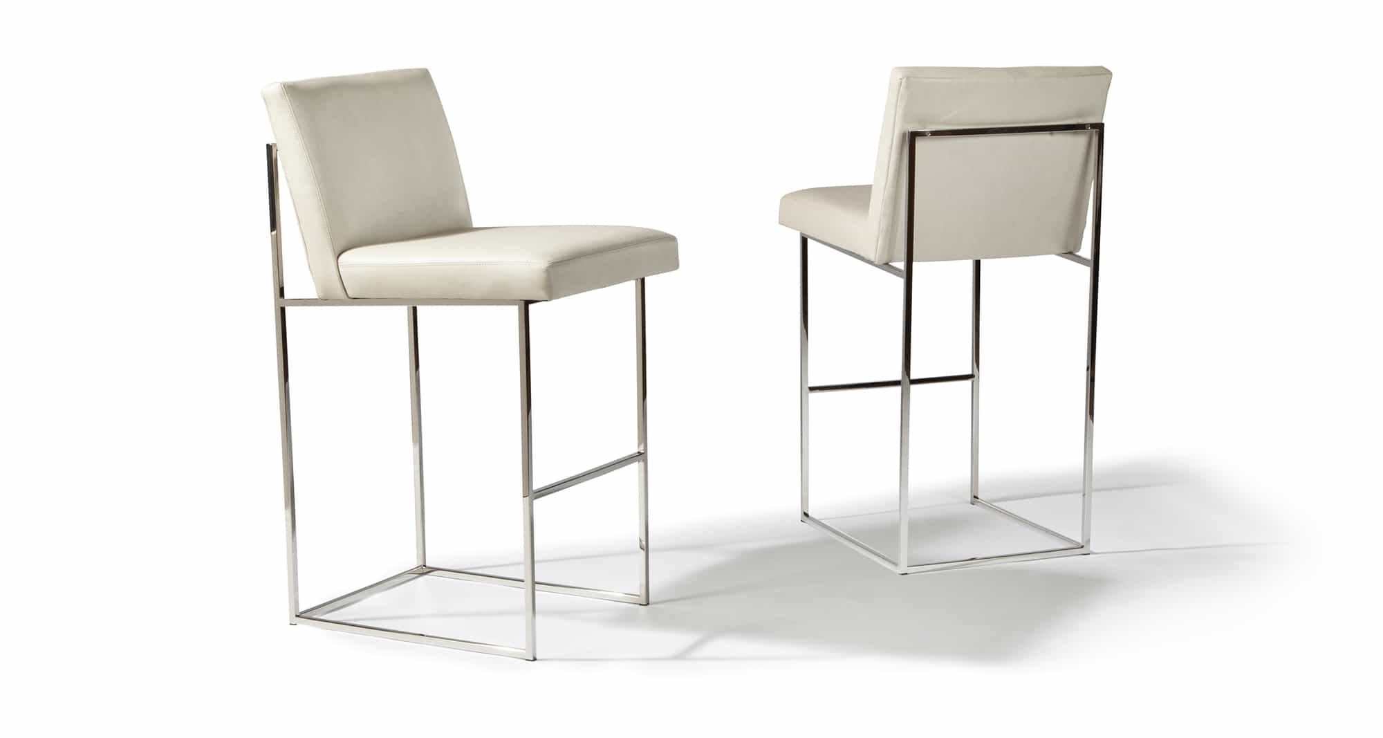 These classic modern bar stools can be upholstered in any of our fabrics or leathers as well as COM. Counter height versions (No. 1187-130) are also available. Polished stainless steel base standard. Base also available in black powder coat (No. 1187-120-BPC), white powder coat (No. 1187-120-WPC), gray powder coat (No. 1187-120-GPC), chocolate bronze powder coat (No. 1187-120-CBPC) or sandblast stainless (No. 1187-120-X) metal finish